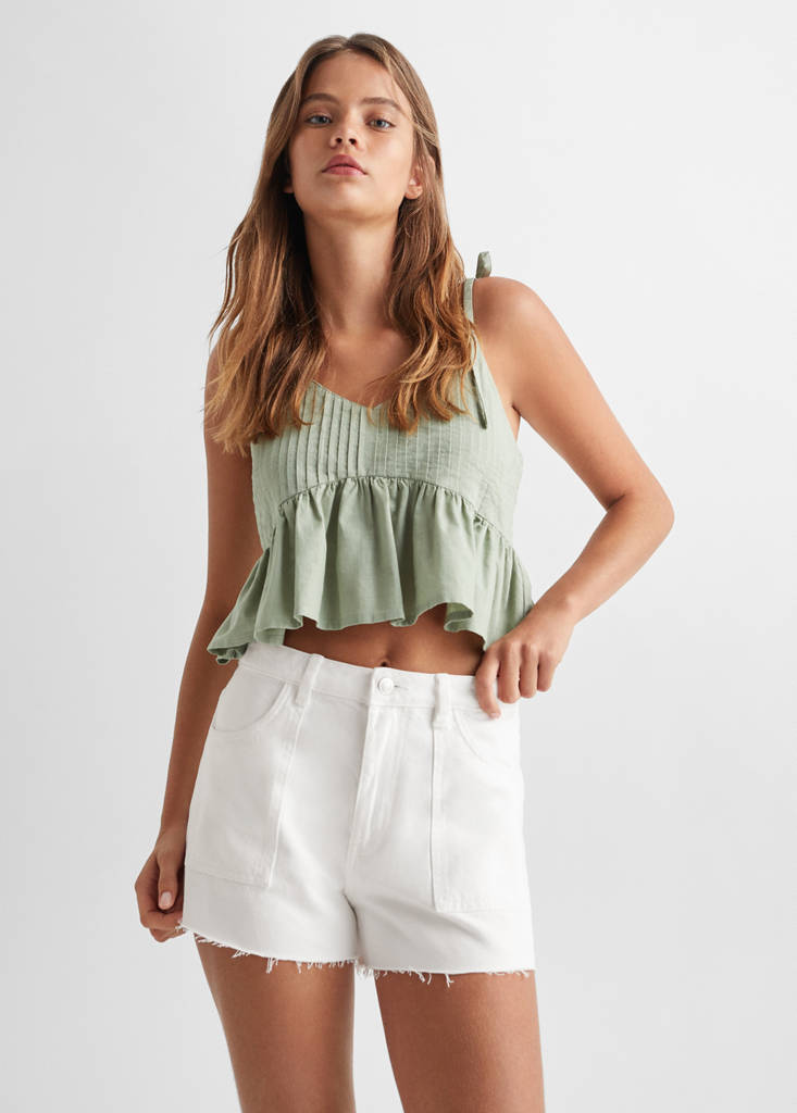 100% algodón, tejido vaquero, diseño corto, diseño recto, tiro medio, cuatro bolsillos, cierre de cremallera y botón, la modelo mide 172 cm y lleva una talla M.