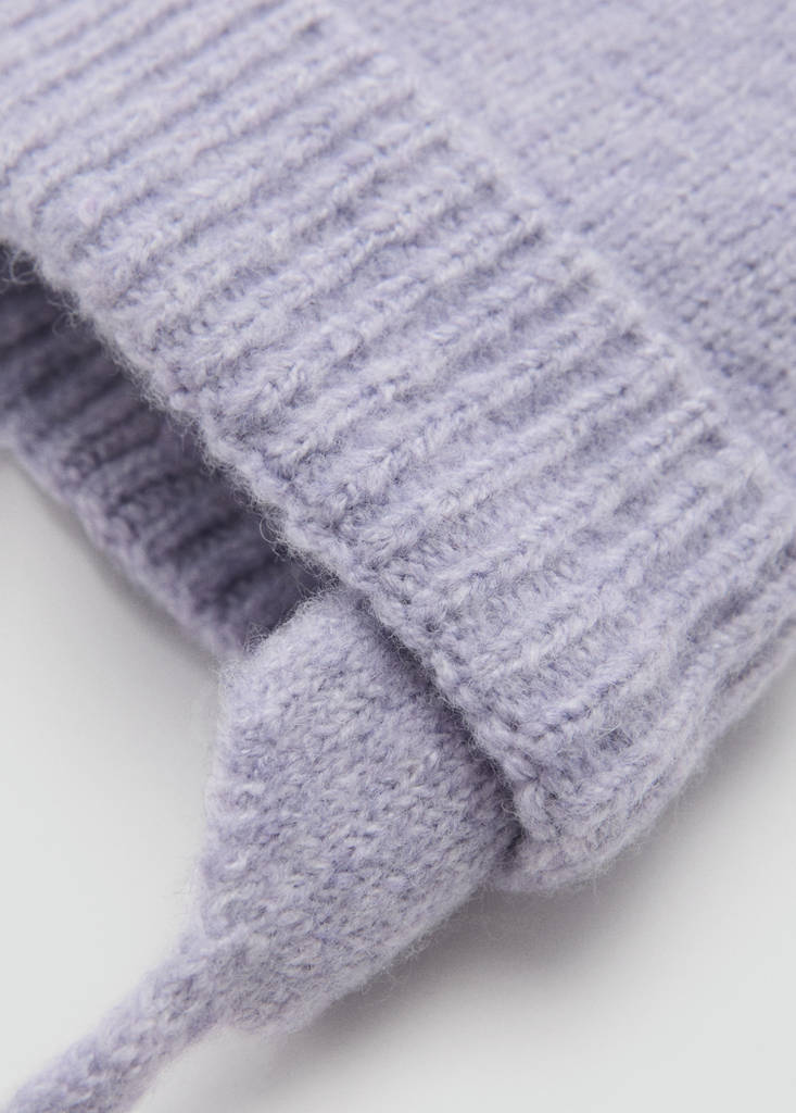 Strickstoff. Zierquaste. Schleifenverschluss. Verfügbares Set. Zu dieser Mütze ist ein passender Schal erhältlich