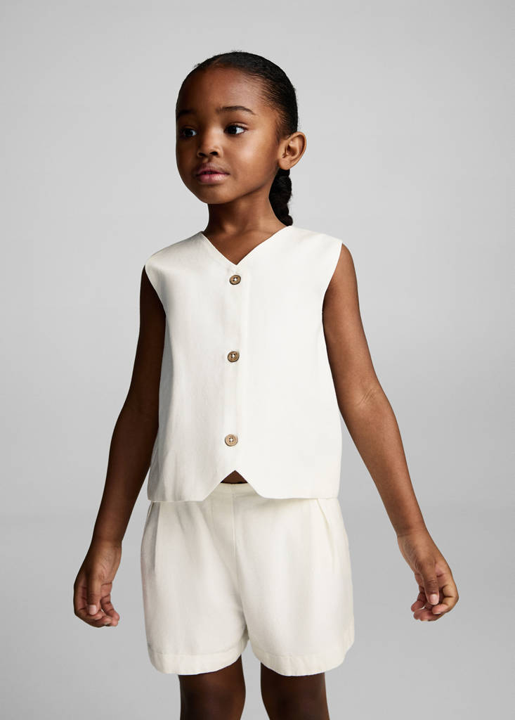 Gewebe mit Leinen. Stoff mit Baumwollanteil. Gerades Design. V-Ausschnitt. Ärmellos. Knopfverschluss. Total Look. Event-Kollektion