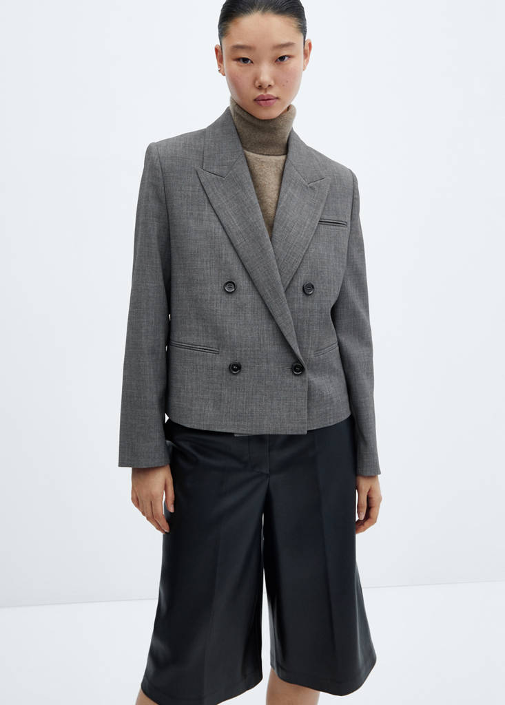 Fließender Stoff. Melierter Stoff. Kurzes Design. Gerades Design. Hemdkragen mit Revers. Lange Ärmel. Brustleistentasche. Zweireihiger Verschluss. Futter. Büro-Looks. Zwei vordere Leistentaschen