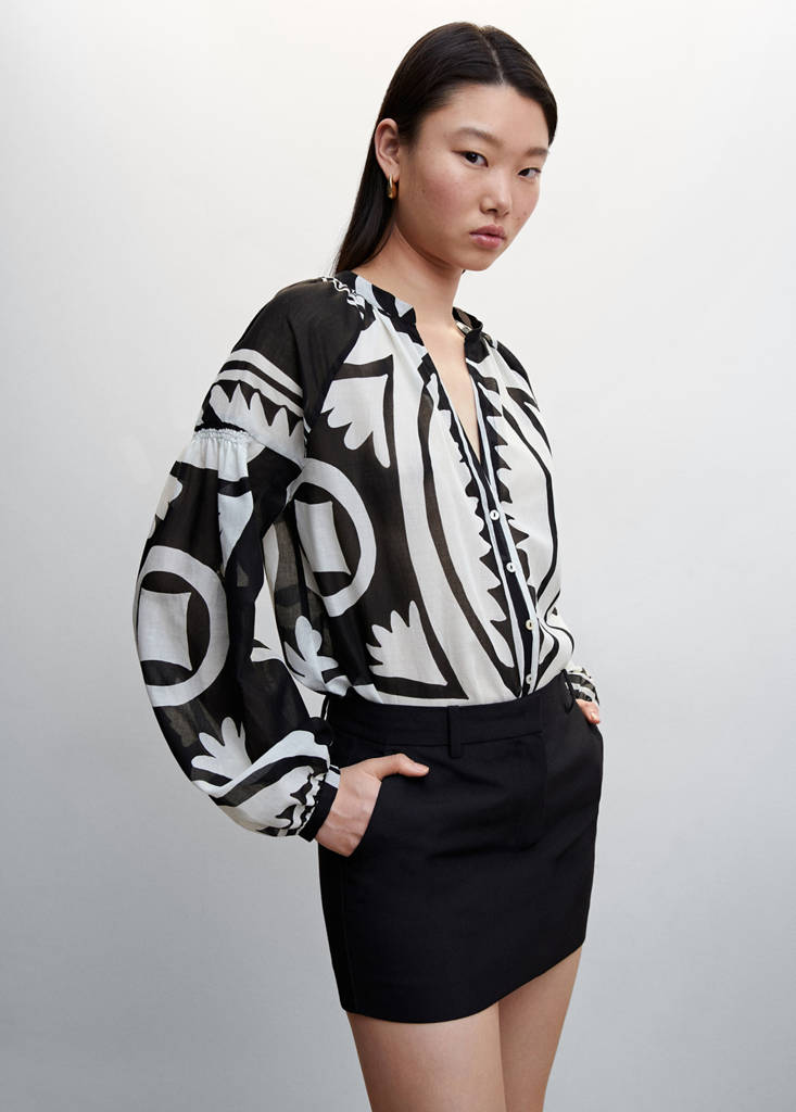 100 % Baumwollgewebe. Oversize-Design. Abstrakter Print. Stehkragen. Langer Ballonärmel. Knopfverschluss vorne