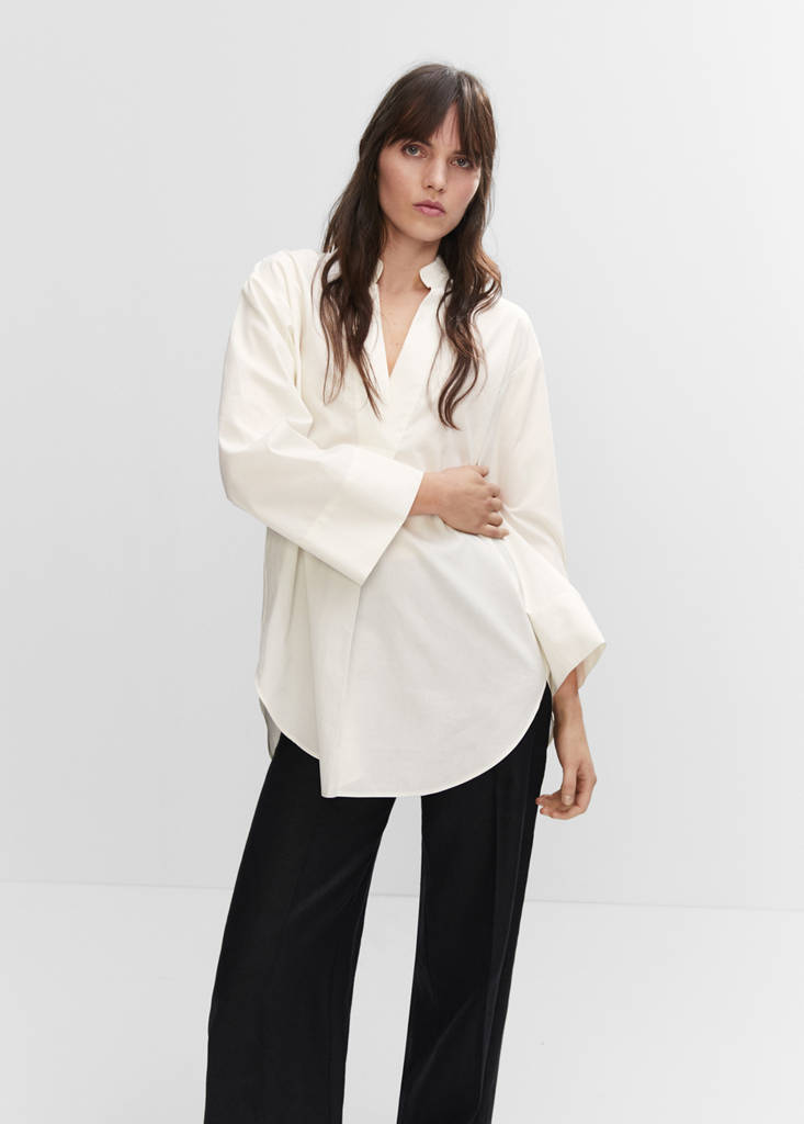 Oversize-Design. Stehkragen. V-Ausschnitt. Lange Glockenärmel. Drapierte Details. Kollektion für Partys, Feierlichkeiten und Kommunionen. Abgerundeter Saum. 100% Baumwolle