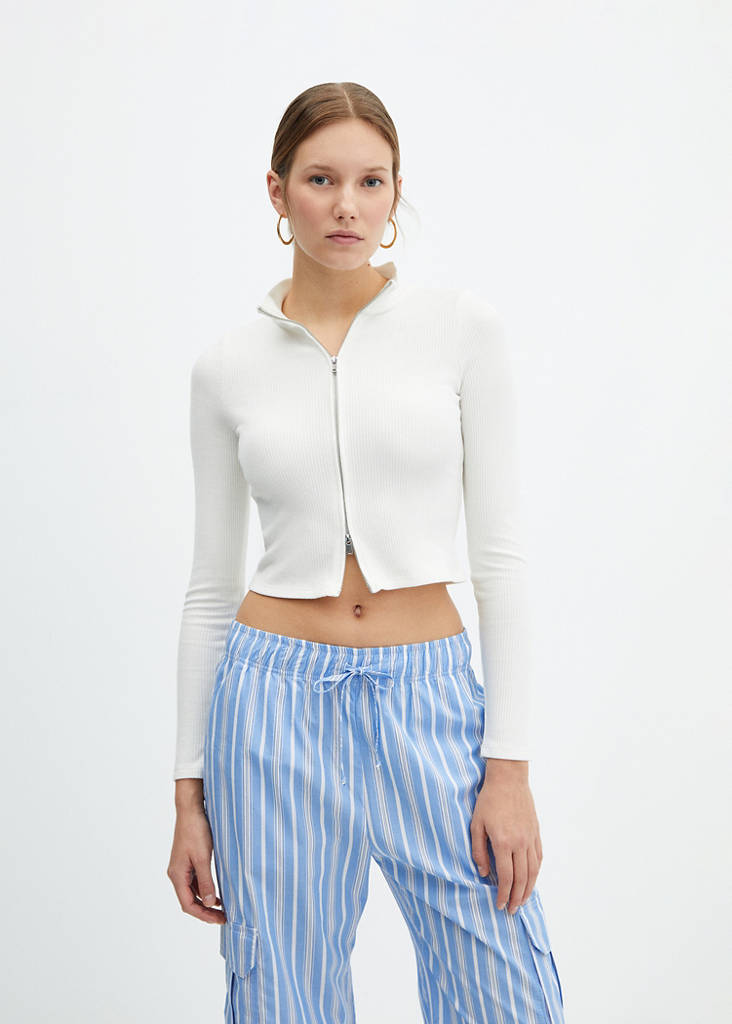 Feinstrick. Rippstrick. Crop-Design. Perkins-Kragen. Lange Ärmel. Reißverschluss auf der Vorderseite. Figurbetontes Design