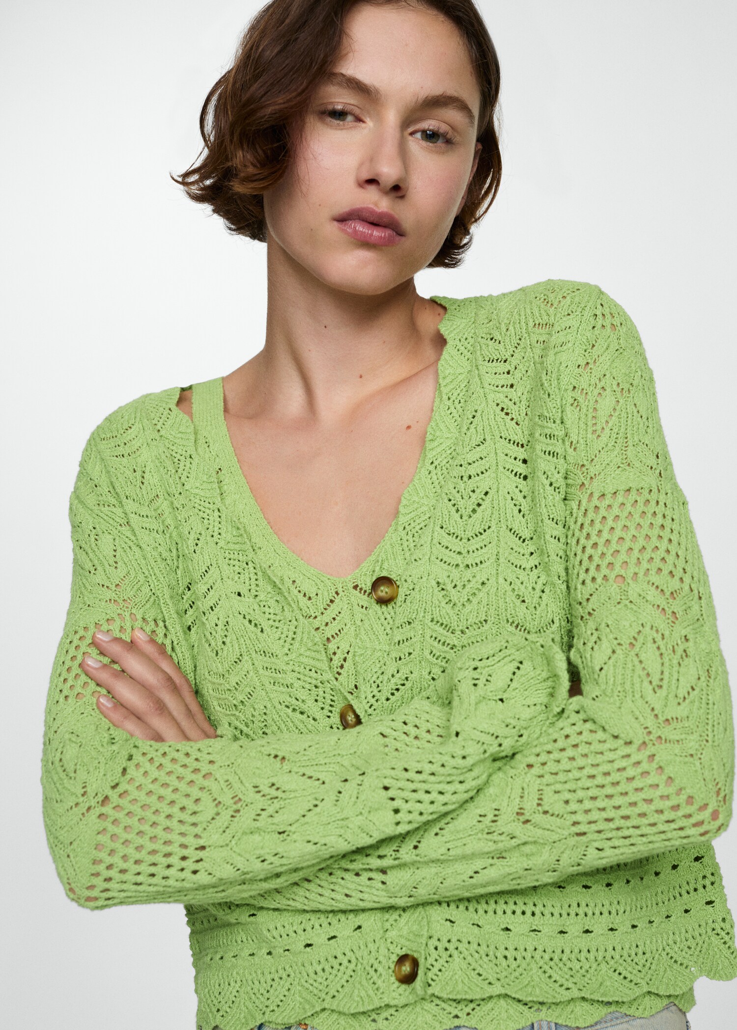 Baumwollmischgewebe. Locker gewebter Strick. Gerades Design. V-Ausschnitt. Langarm. Gestickte Details. Mit Muschelsaum. Vorderer Verschluss mit Knöpfen.