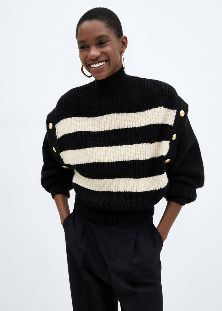 Mittellinie. Gerades Design. Perkins-Kragen. Lange Ärmel. Zierknöpfe. Rippbündchen. Büro-Looks. Streifendesign