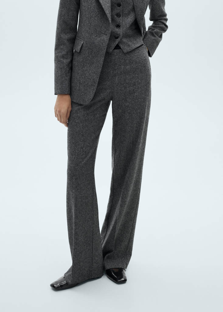 Woll-Mischgewebe. Melierter Stoff. Anzugstil. Langes Design. Gerades Design. Tiefer Sitz. Unsichtbarer seitlicher Reißverschluss. Total Look