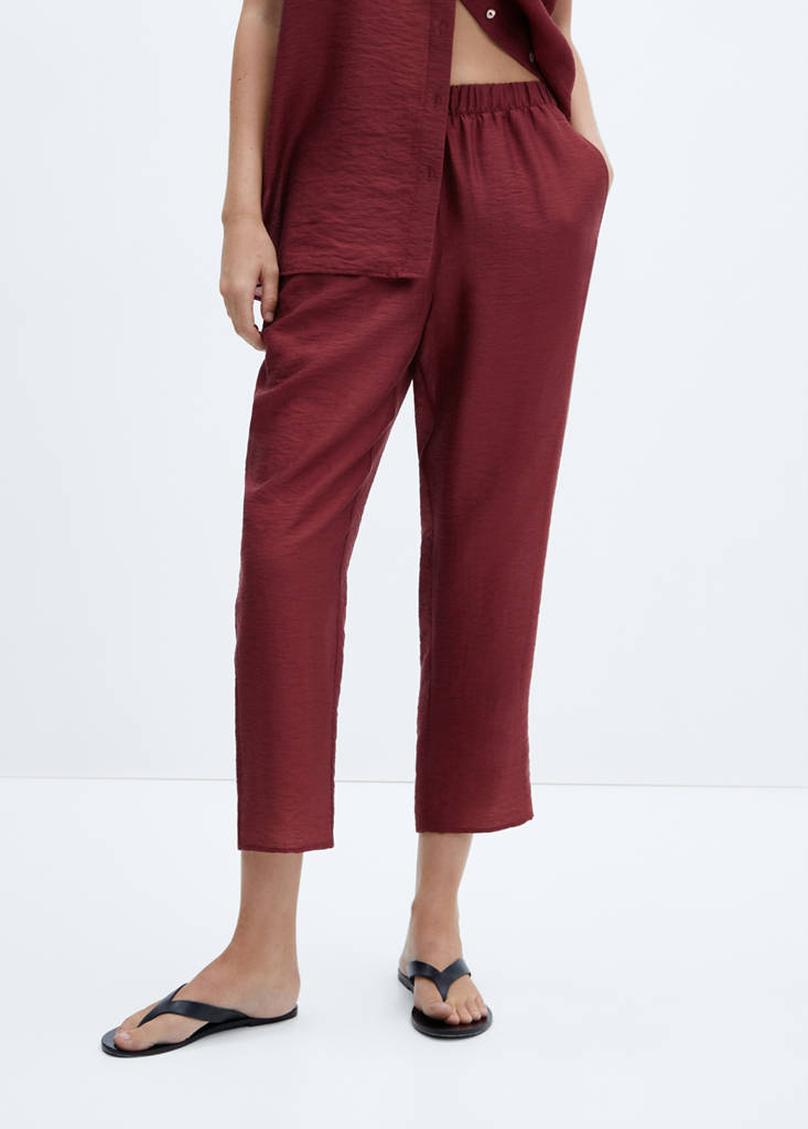 Lyocell-Mischgewebe. Satinierter Stoff. Jogger-Design. Gerades Design. Crop-Design. Zwei seitliche Taschen. Zwei paspelierte Gesäßtaschen mit Knopf. Bund mit Gummizug. Ohne Verschluss. Total Look