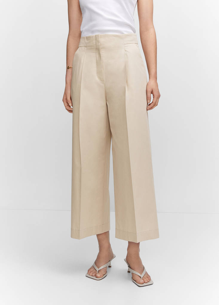 100 % Baumwollgewebe. Im Culottes-Stil. Crop-Design. Mittlerer Sitz. Zwei Seitentaschen. Paspeltasche hinten. Verdeckter Knopf-, Haken- und Reißverschluss. Büro-Looks
