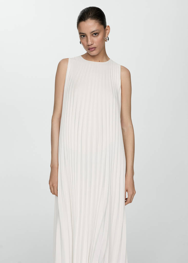 Fließender Stoff. Oversize-Design. Langes Design. Gerades Design. Plissee-Design. Rundhalsausschnitt. Ärmellos. Knopfverschluss hinten. Futter