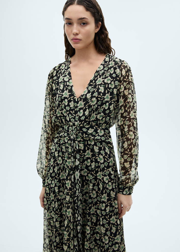 Fließender Stoff. Chiffonstoff. Gerades Design. Langes Design. Blumenmuster. V-Ausschnitt. Lange Ärmel. Seitlicher Reißverschluss. Futter