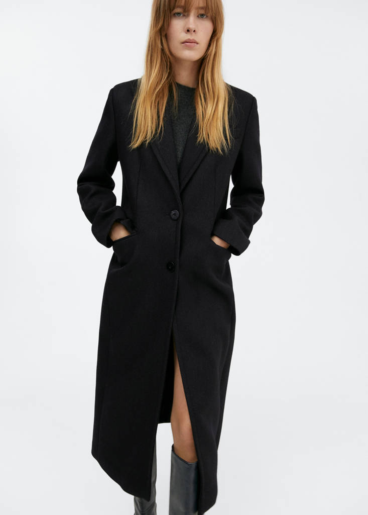 Woll-Mischgewebe. Midi-Design. Gerades Design. Hemdkragen mit Revers. Lange Ärmel mit Knopfmanschetten. Brustleistentasche. Zwei Pattentaschen vorne. Zweiknopfverschluss vorne. Ziernähte. Relief-Detail. Futter. Büro-Looks. Selection Kollektion