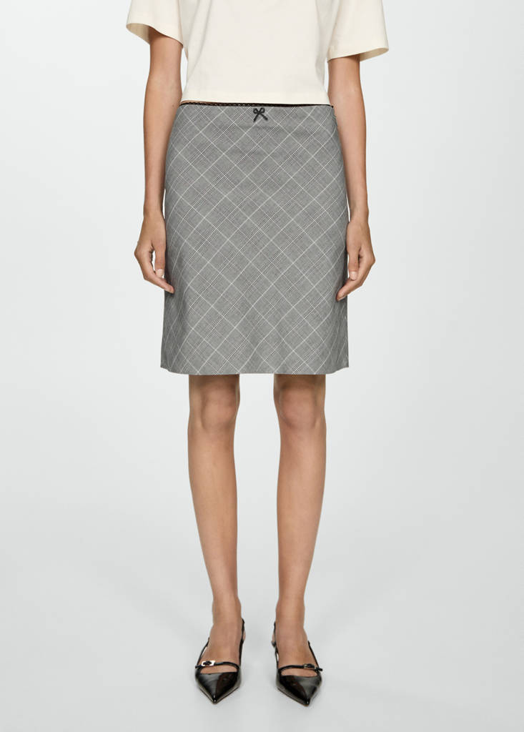 Fließender Stoff. Kurzes Design. Gerades Design. Karomuster. Unsichtbarer seitlicher Reißverschluss. Zierschleife. Abschlüsse aus Spitze