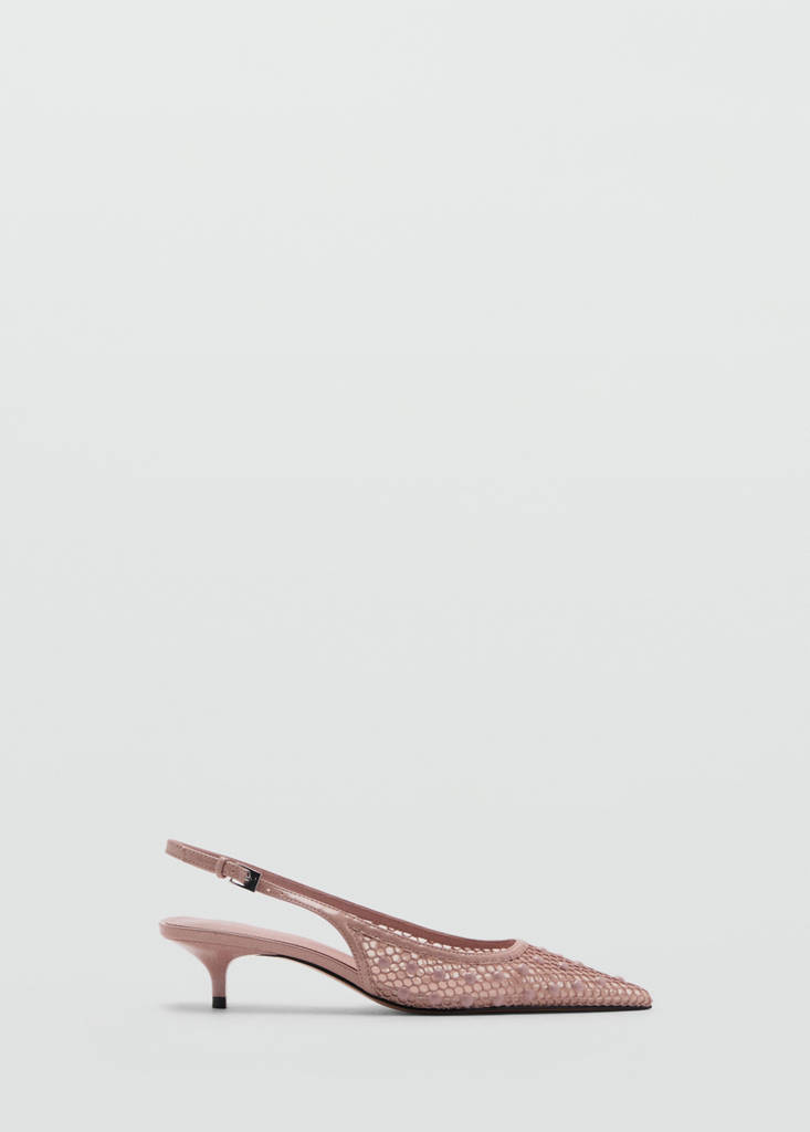 Mesh-Gewebe. Spitz zulaufend. Absatzhöhe: 3 cm. Applikation mit dekorativen Kugeln. Riemenverschluss mit Schnalle. Innenfutter