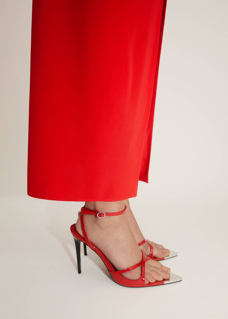 Der Lederschuh mit Metallic-Spitze verleiht Ihrem Look eine moderne und raffinierte Note. Die gekreuzten Riemen und das Fesselriemchen sorgen dafür, dass Sie sich die ganze Nacht über sicher und wohl fühlen. 100% Leder. Stilettoabsatz. Schnallenverschluss. Spitz zulaufend. Metallapplikation an der Spitze. Fußkette. Riemendesign. Absatzhöhe: 11 cm. Kollektion für Partys, Feierlichkeiten und Kommunionen. Artikel aus der CAPSULE-Kollektion können innerhalb von 14 Tagen ab dem Versanddatum umgetauscht oder zurückgegeben werden