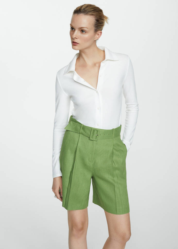 100% Leinen. Gerades Design. Kurzes Design. Hohe Taille. Gürtelschlaufen. Reiß- und Hakenverschluss. Gürtel mit Schnallenverschluss. Bundfalten