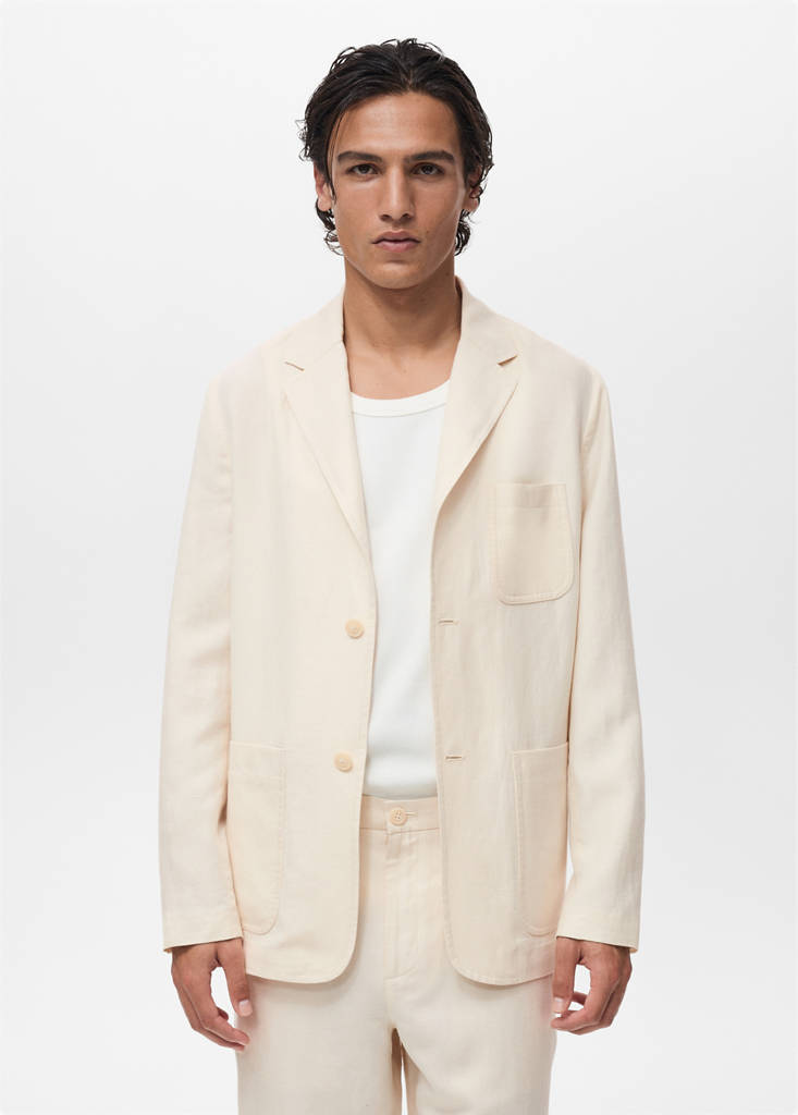 Leinen-Lyocell-Mischgewebe. Regular Fit. Fallendes Revers. Aufgesetzte Brusttasche. Zwei seitliche aufgesetzte Taschen. Vorderer Verschluss mit Knöpfen. Rückenschlitz am Saum. Manschetten mit Knopfverschluss