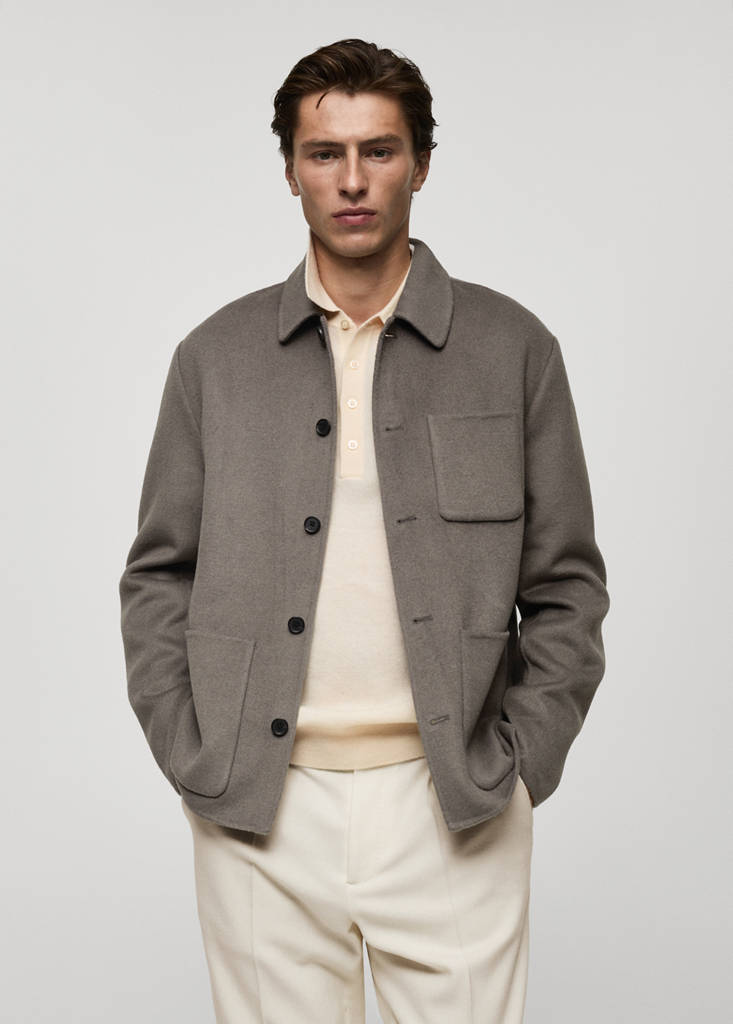 Handmade Design. Woll-Mischgewebe. Regular Fit. Schornsteinkragen. Aufgesetzte Brusttasche. Zwei aufgesetzte Taschen vorne. Lange Ärmel. Gerader Saum. Selection Kollektion. Vorderer Verschluss mit Knöpfen