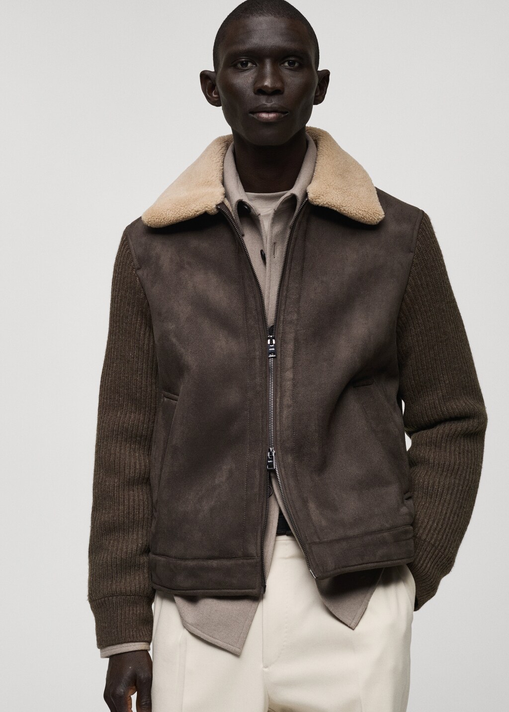 Gerader Schnitt. Gewebe mit Wildleder-Effekt. Hemdkragen. Reißverschluss. Zwei Seitentaschen. Lammfellfutter. Kontrastierende Ärmel mit Rippmuster. Lammfellkragen. Hemdkragen aus Kunstshearling. Innenfutter aus Kunstshearling.