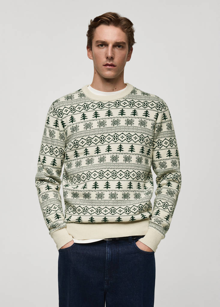 Exklusiv online, rundhalsausschnitt, mittelfeiner Strick, weihnachts-Print, regular Fit, gerippte Abschlüsse, das Model ist 185 cm groß und trägt Größe M.