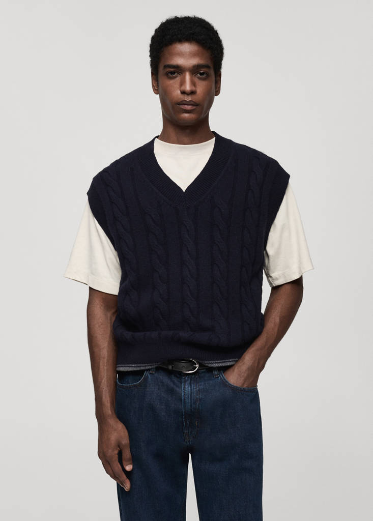 Woll-Mischgewebe. Struktur Strick Grobstrick. Flechtdesign. V-Ausschnitt. Ärmellos. Saum mit Kontrastborte