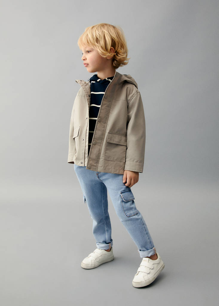Baumwollstoff im Jeans-Stil. Langes Design. Gerades Design. Zwei Cargotaschen. Zwei Pattentaschen. Zwei Leistentaschen hinten. Elastischer Bund. Druckknopfverschluss