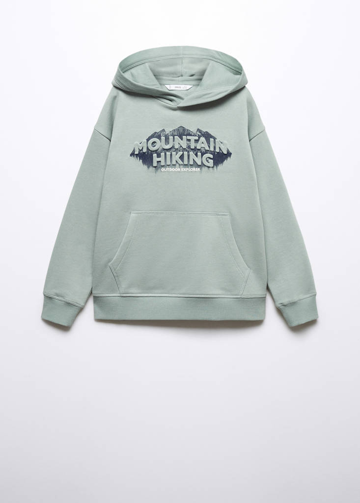 100% Baumwolle. Bedruckte Botschaft. Gebürstetes Gewebe. Gerades Design. Kapuze. Lange Ärmel