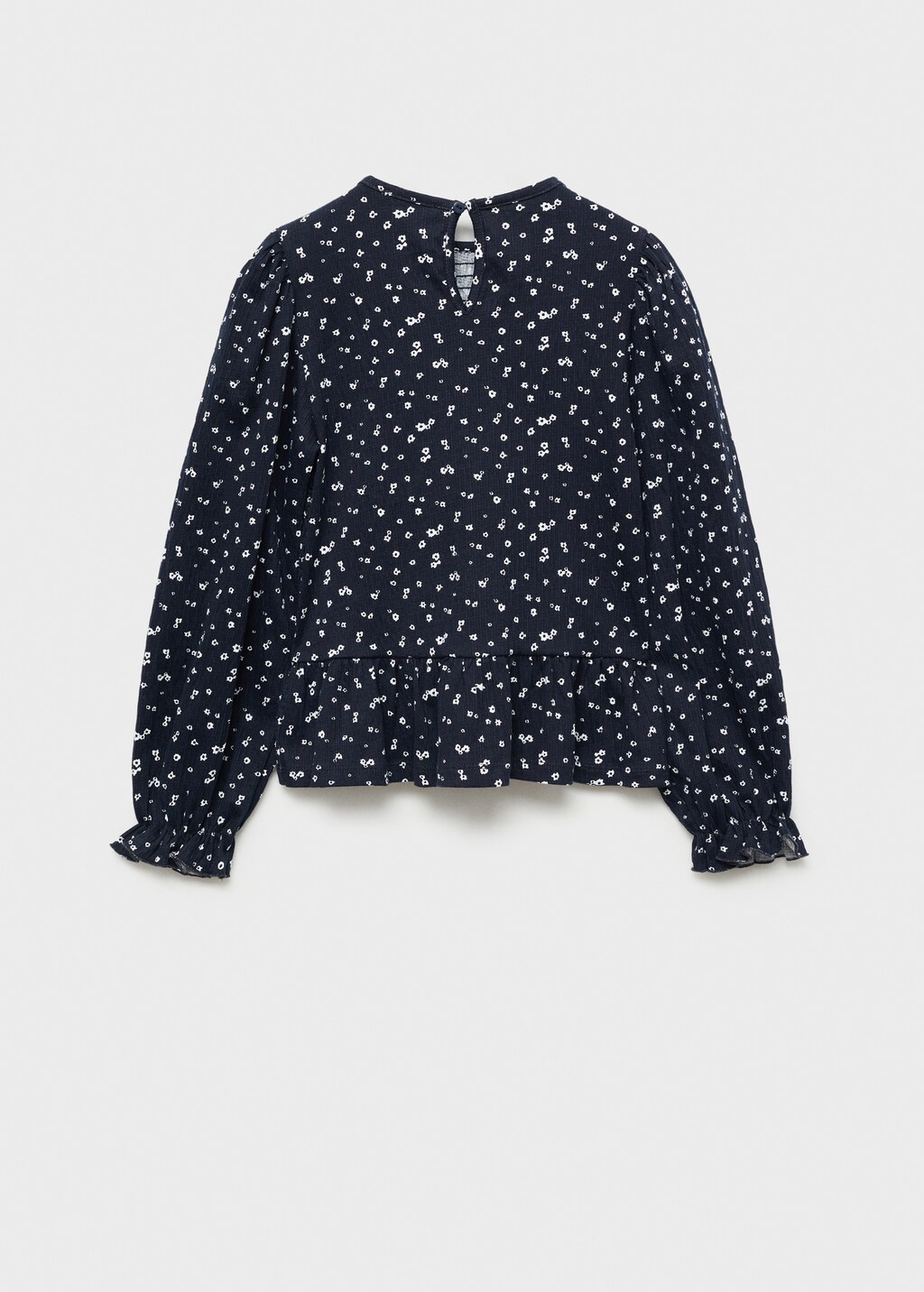 Gerader Schnitt. Bedrucktes Design. Rundhalsausschnitt. Langer Ärmel mit Rüschen. Tropfenverschluss hinten.