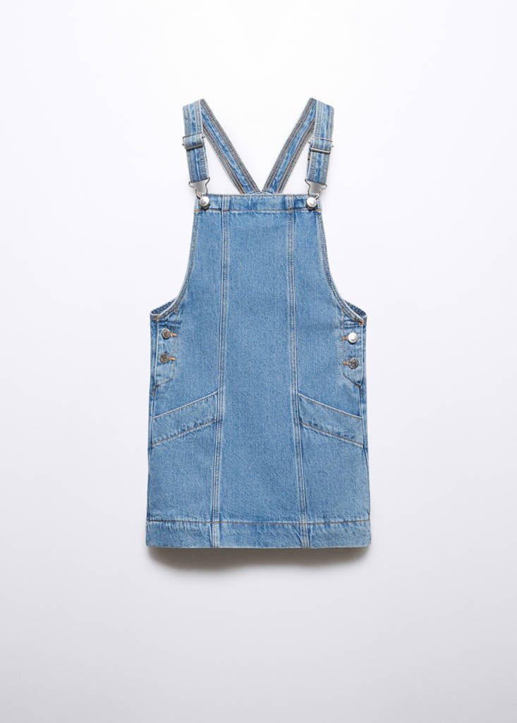 Basics-Kollektion. Baumwollstoff im Jeans-Stil. Kurzes Design. Breite Träger. Zwei Pattentaschen. Gerader Ausschnitt. Ärmellos. Knopfverschluss. Back to School