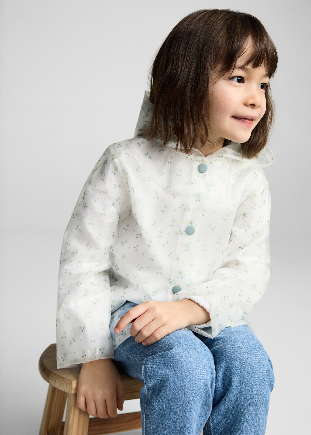 Design imperméable. Motif imprimé. Design transparent. Manche longue. Capuche. Fermeture par boutons-pression.