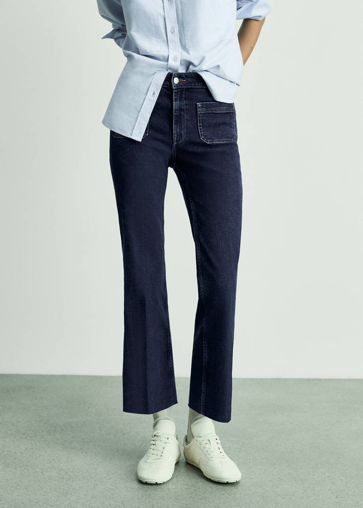 Tissu en coton de style jean. Taille mi-haute. Design long. Deux poches plaquées à l'avant. Deux poches plaquées à l'arrière. Passants de ceinture. Flare. Fermeture Éclair et bouton à l’avant. Longueur intérieure 70 cm