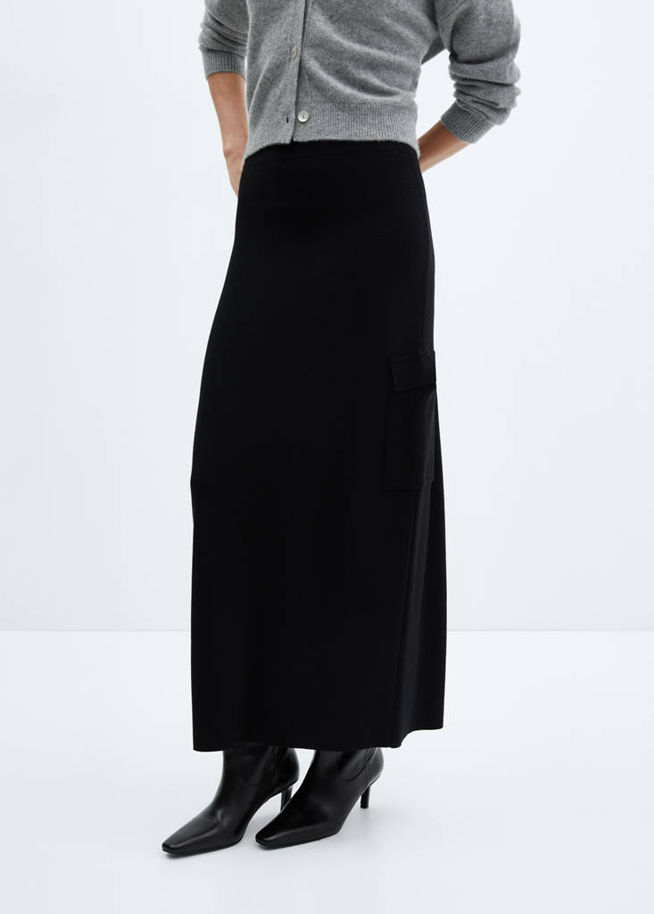 Tissu fluide. Maille fine. Design long. Coupe droite. Deux poches cargo. Taille élastiquée. Sans fermeture. Ouverture arrière en bas