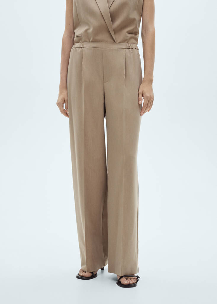 Tissu fluide. Style costume. Deux poches latérales. Design long. Coupe droite. Total look. Taille élastiquée
