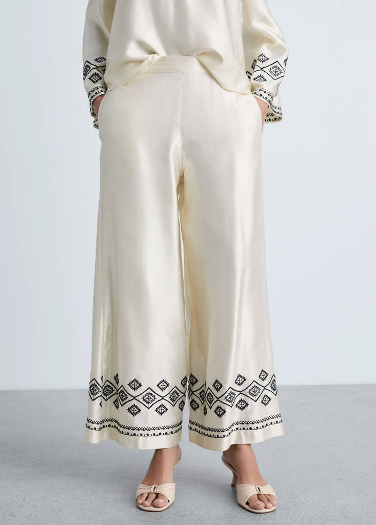 Tissu en mélange de coton. Tissu satiné. Design wideleg. Taille haute. Taille élastiquée. Broderie décorative sur l'ourlet. Sans fermeture. Total look