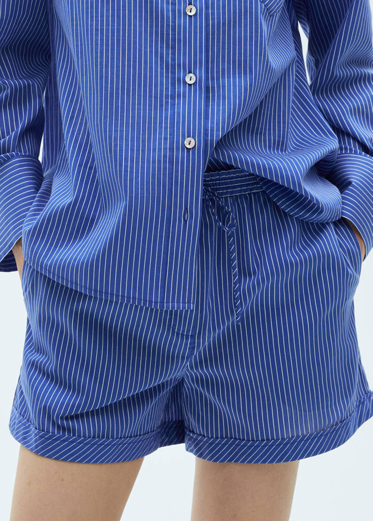Tissu en mélange de coton et lyocell. Tissu léger. Coupe droite. Design court. Imprimé à rayures. Taille élastique avec cordon. Sans fermeture. Bande élastique