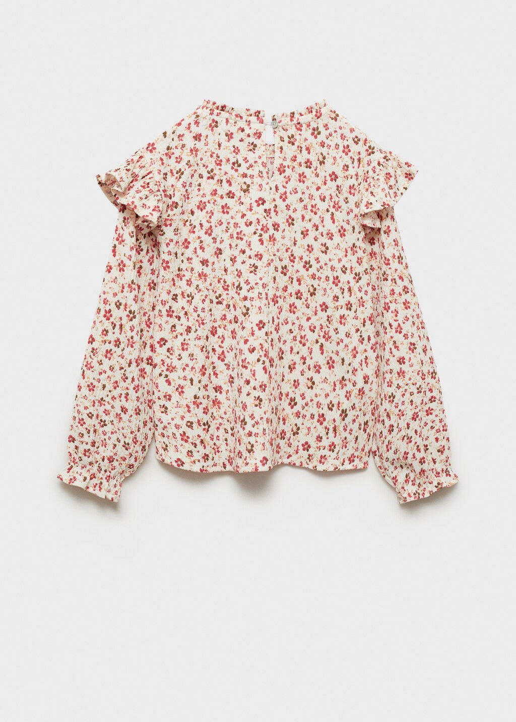 Coupe droite. Motif floral. Col rond. Manche longue. Détail de volants. Fermeture par bouton à l'arrière.