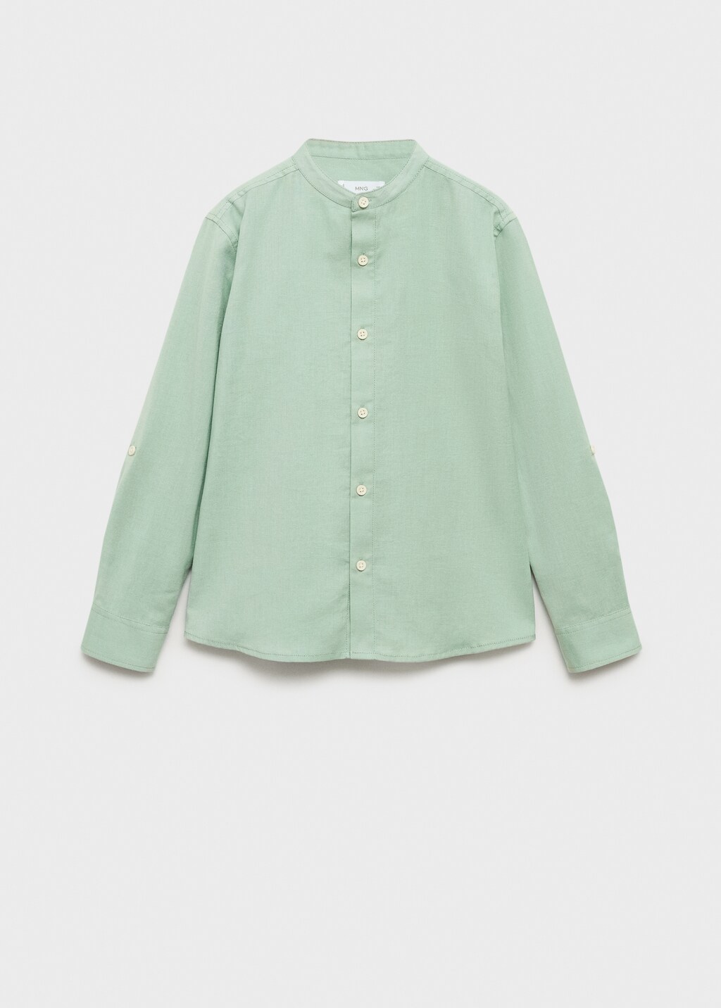 Tissu en coton. Tissu en lin. Design droit. Col mao. Manches longues et poignets boutonnés. Fermeture avant avec boutons.