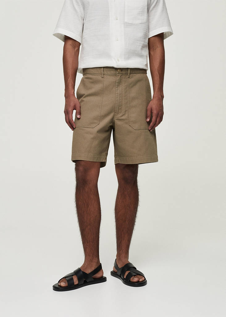Passants de ceinture. Fermeture avant à double boutonnage et fermeture éclair. Deux poches plaquées à l'avant. Deux poches à rabat boutonnées à l'arrière. Patte de serrage latérales à la taille avec fermeture à bouton. Tissu 100 % coton. Tissu à chevrons