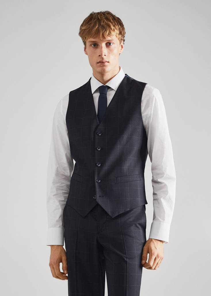 Coupe courte. Motif à carreaux. Slim-fit. Col en V. Sans manches. Fermeture boutonnée. Deux poches à rabat sur le devant. Boucles réglables. Doublure. Poche intérieure. Le mannequin mesure 185 cm et porte une taille 50