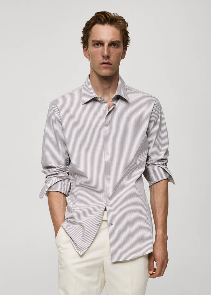 Slim fit. Coupe standard. Tissu de coton légèrement extensible. Imprimé milleraies. Manches longues et poignets boutonnés. Fermeture avant avec boutons. Ourlet arrondi. Col classique