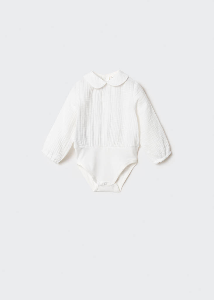 100% coton. Tissu plumetis. Col babydoll. Manche longue. Fermeture à boutons. Fermeture par boutons-pression