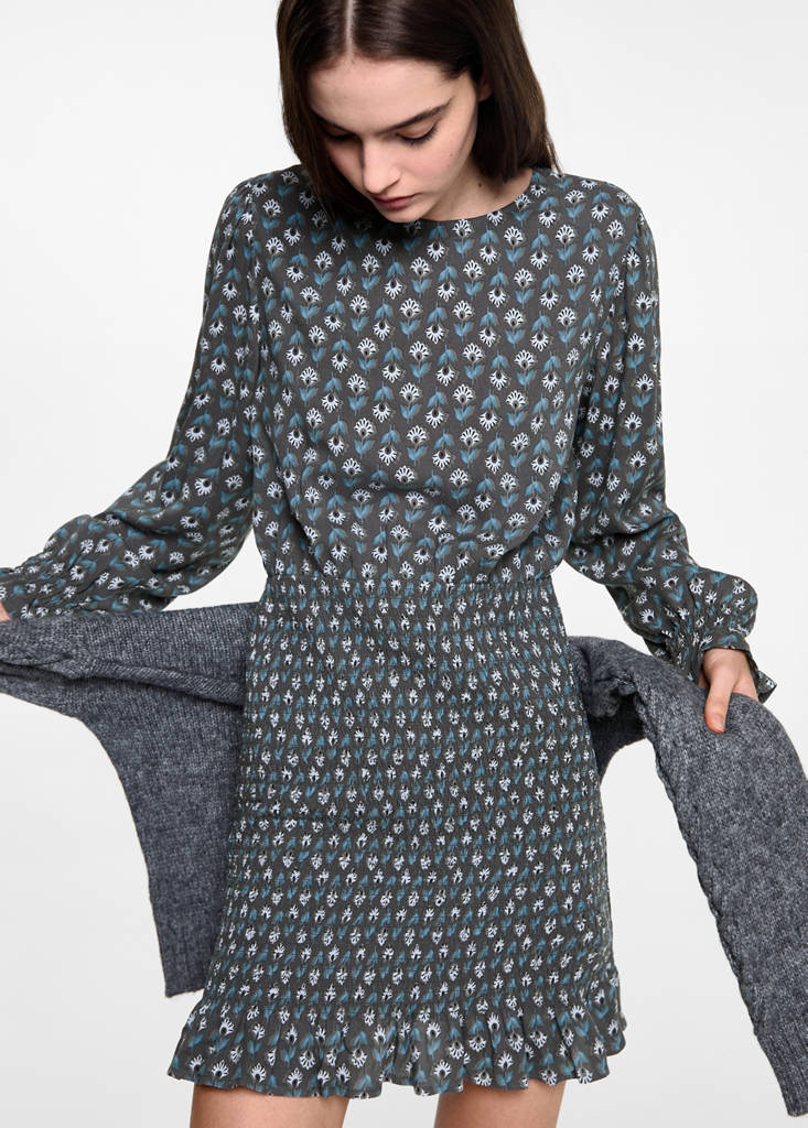 Coupe droite. Design imprimé. Design court. Col rond. Manches longues. Détails froncés. Ourlet à volants. Fermeture par bouton à l'arrière