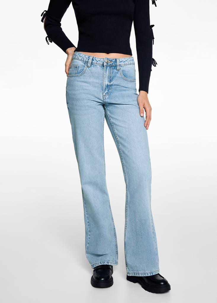 Tissu en coton de style jean. Style flare. Design long. Cinq poches. Logo Mango brodé sur un côté. Fermeture éclair et bouton