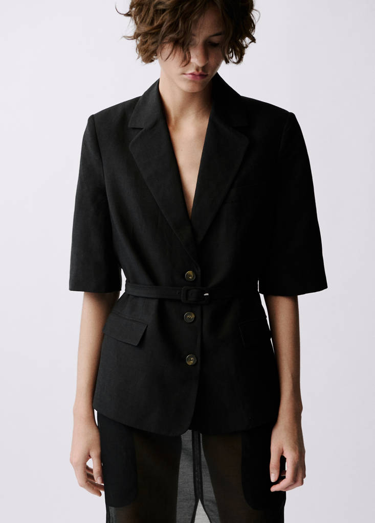 Linnenmix stof. Pakstijl. Recht ontwerp. V-hals met revers. Ingesneden revers. Driekwart mouw. Riemlussen. Ceintuur met gespsluiting. Twee klepzakken aan de zijkanten. Voorste knoopsluiting. Total look