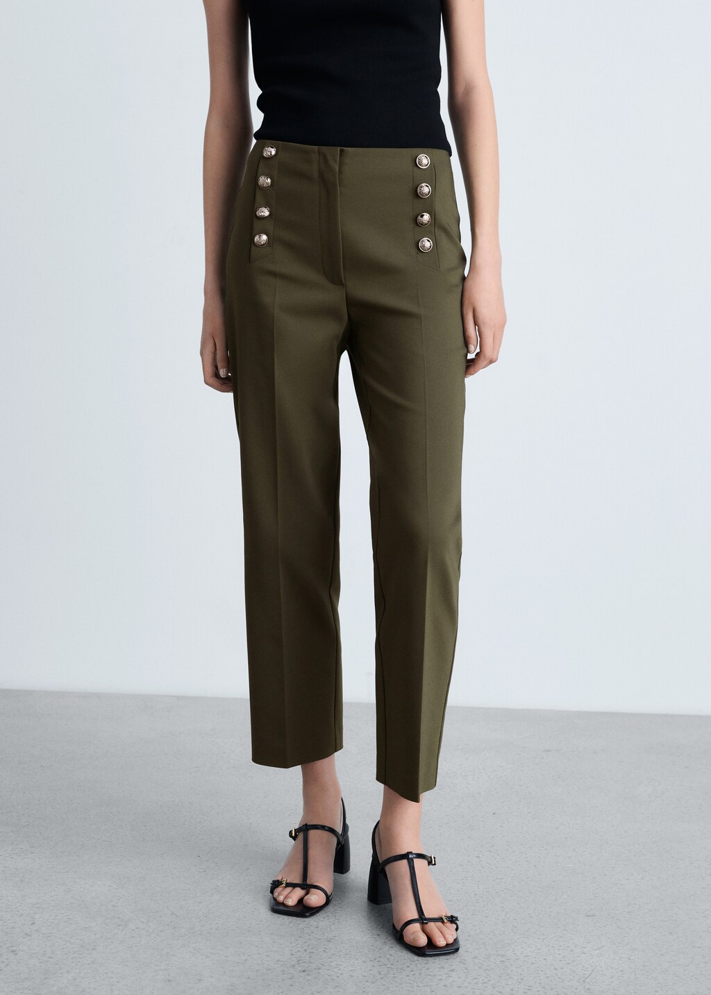 Katoenmix stof. Lang ontwerp. Recht ontwerp. Crop ontwerp. Middelhoge taille. Twee zijzakken. Blinde knoop, haak- en ritssluiting. Knopen met juweeleffect. Verkrijgbaar in Plus. Binnenvoering.