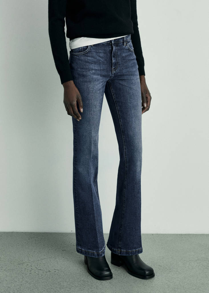 Denimachtige katoenen stof. Klokontwerp. Flared stijl. Low-rise. Riemlussen. Vijf zakken. Rits- en knoopsluiting aan de voorkant. Volledige lengte. Binnenlengte 85 cm