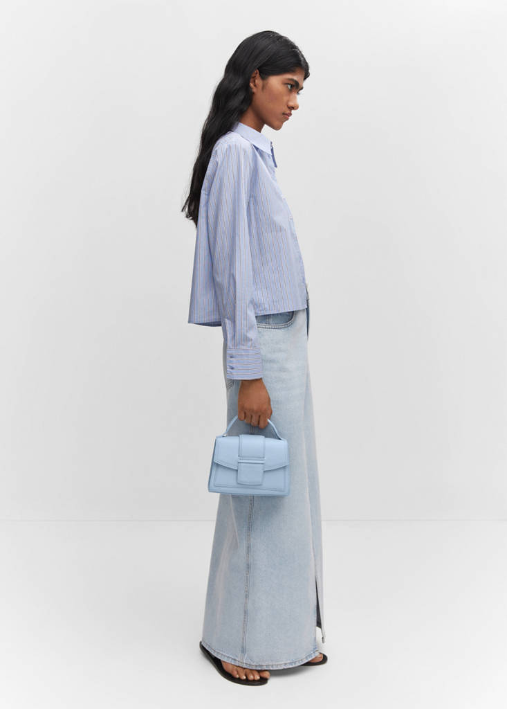 Klein formaat. Dunne metalen ketting. Buitenzakje. Omslag sluiting. Metalen magneetsluiting. Voering