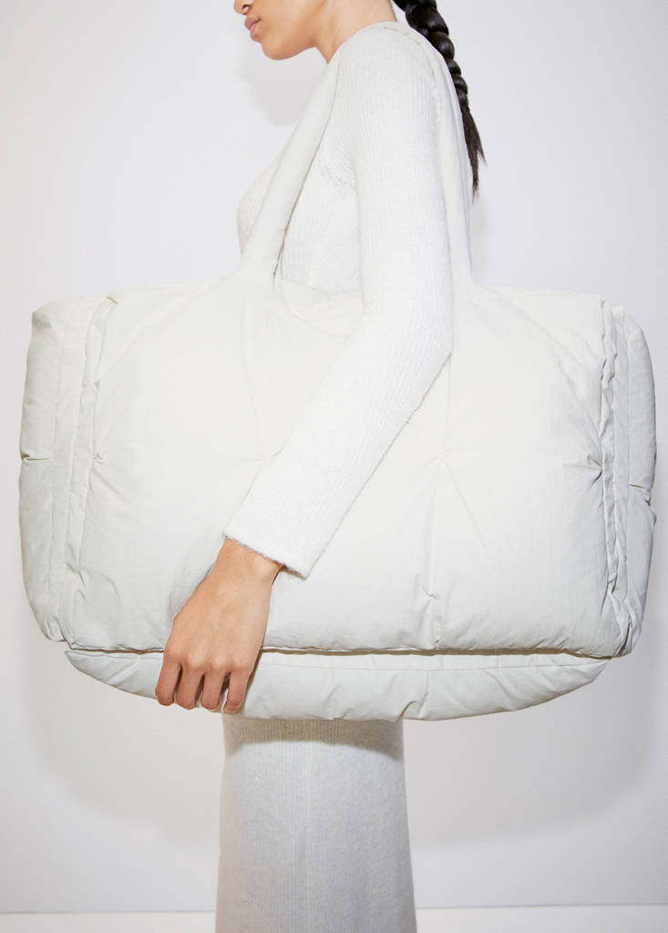 Beyond-collectie. Groot formaat. Katoenmix stof. Gewatteerd ontwerp. Rechthoekig ontwerp. Dubbel kort handvat. Schouderriem. Zonder sluiting. Voering