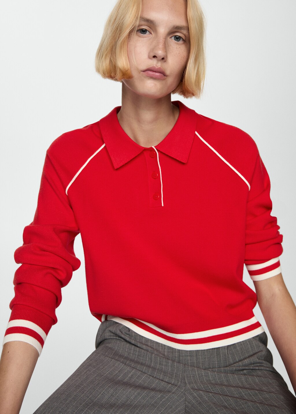 Fijn breiwerk. Recht ontwerp. Polokraag met knoopsluiting. Korte mouwen met elastische manchetten. Contrasterende afwerkingen. Ontwerp met strepen.