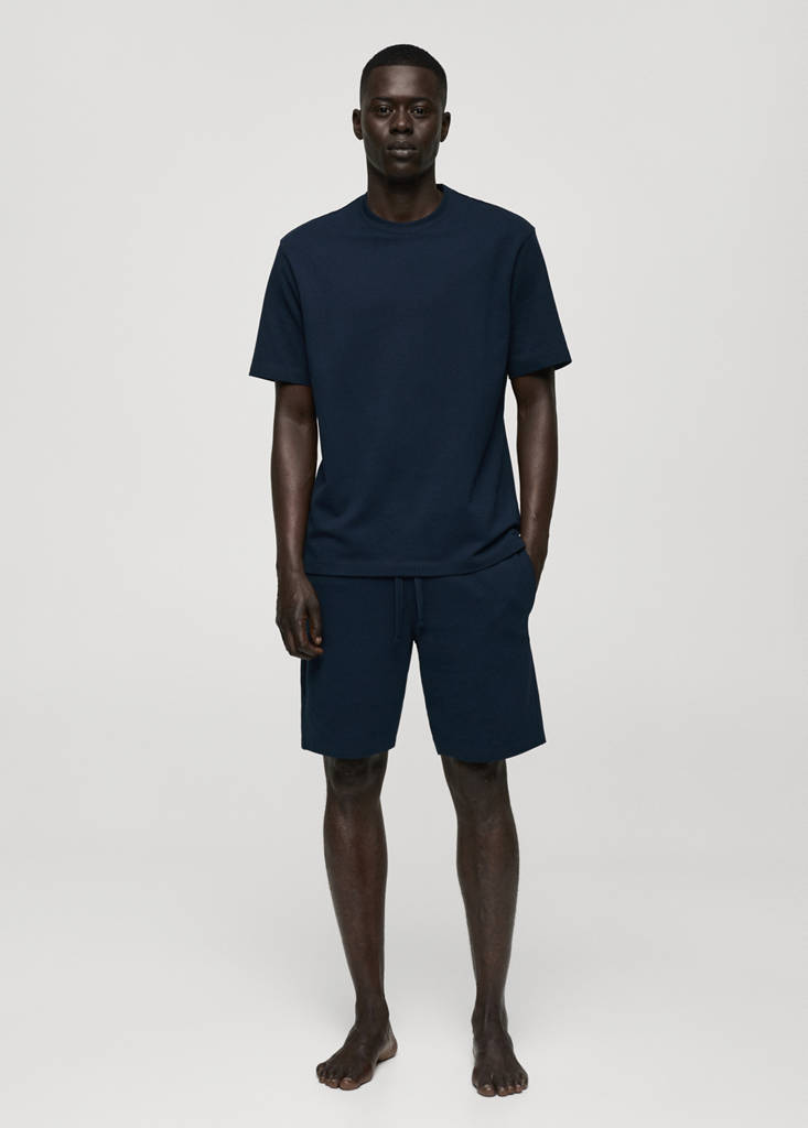 Inclusief bewaarzakje. Katoenen stof. Effen stof. T-shirt met korte mouwen. Bermuda met elastische tailleband. Tailleband met aansnoerkoord
