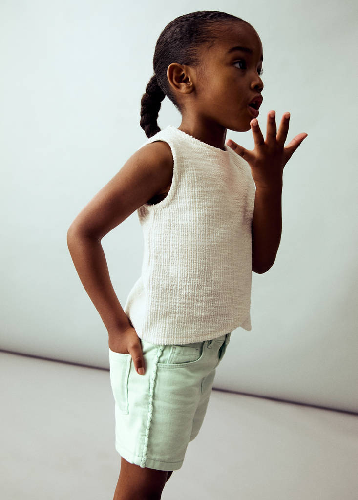 Denimachtige katoenen stof. Korte snit. Recht ontwerp. Riemlussen. Vijf zakken. Drukknoopsluiting. Zijbanddetail